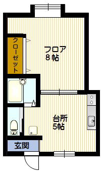 | 間取詳細 | 1K/8帖(フロア)・5帖(台)・バス・トイレ |