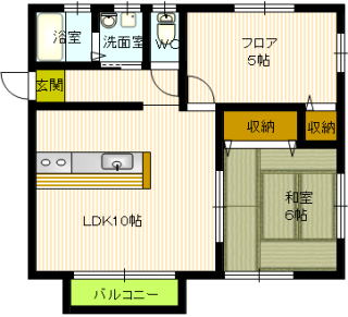 | 間取詳細 | 2LDK/10帖(LDK)・5帖(フロア)・6帖(和)・洗面室・バス・トイレ |