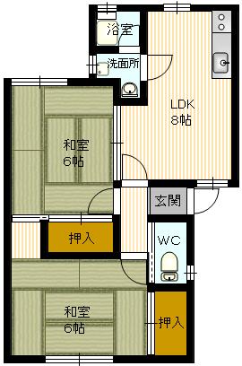 | 間取詳細 | 2LDK/8帖(LDK)・6帖(和)・6帖(和)・バス・トイレ |